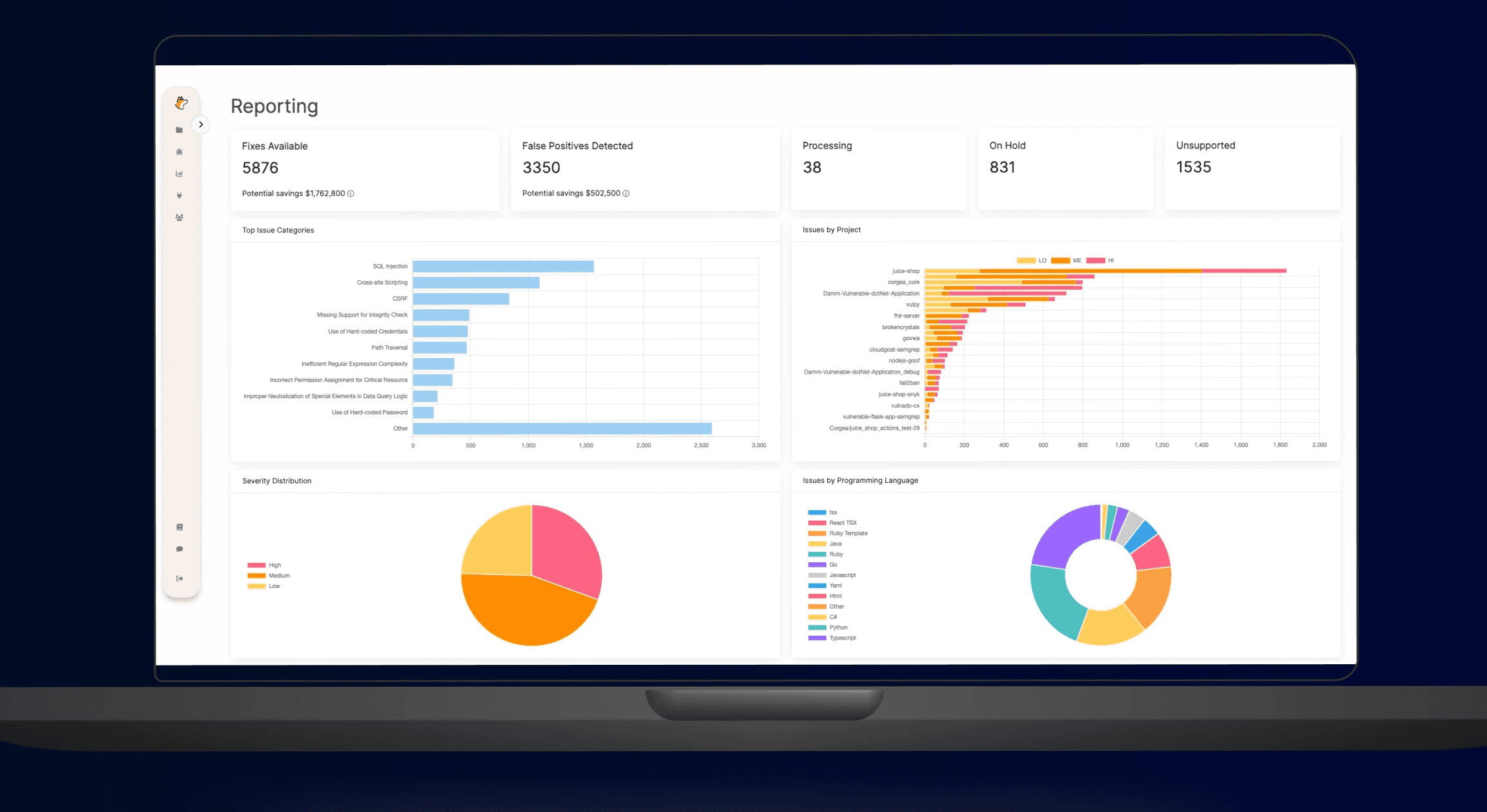 Track code, dependency, code quality, IaC, scan activity, aging, and developer insights in one place. Filter reporting by project, tags, and time to see trends clearly.
