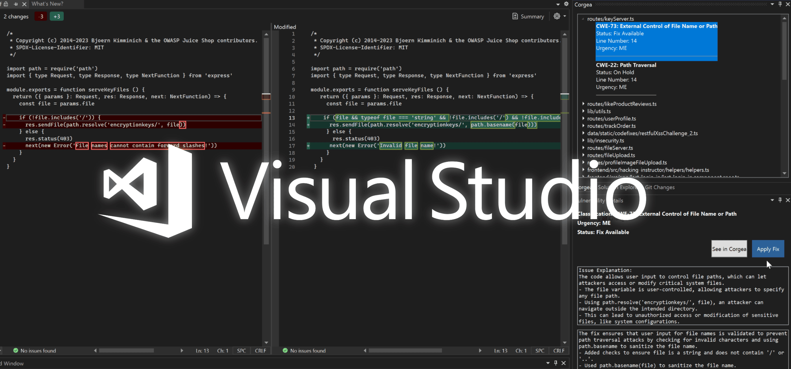 Boost productivity & secure your code with Corgea's Visual Studio IDE Plugin. Detect & fix vulnerabilities automatically with AI-generated fixes.