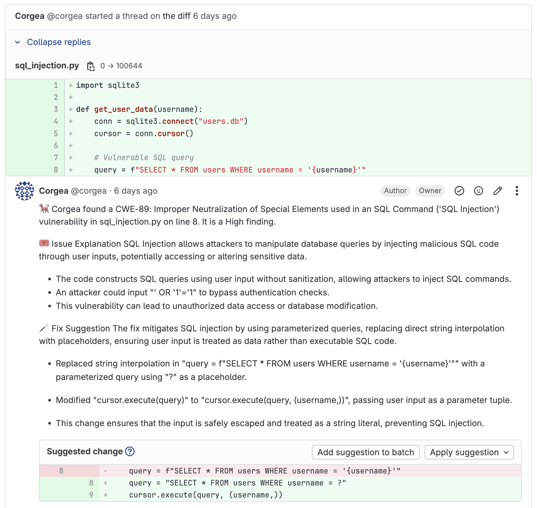 Scan and Remediate: Corgea will automatically scan your code repositories whenever new Merge Requests are opened. If vulnerabilities are found, Corgea will generate secure code fixes and provide you with the option to apply them directly to your codebase.