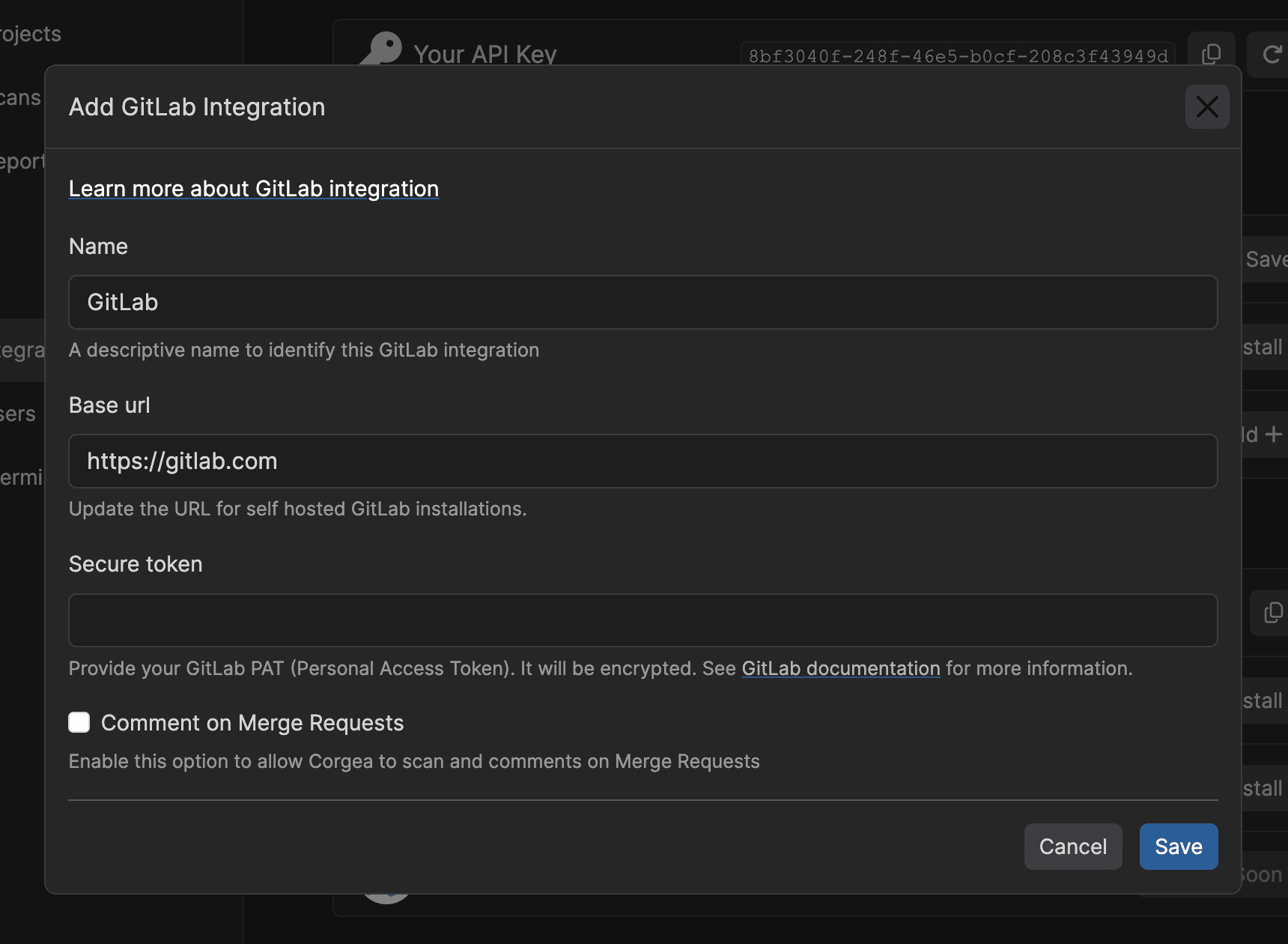 Connect Corgea to GitLab: Start by connecting your GitLab account or organization to Corgea. This can be done through the Corgea web interface by following the instructions in the documentation. You can also choose to scan Merge Requests using Corgea.