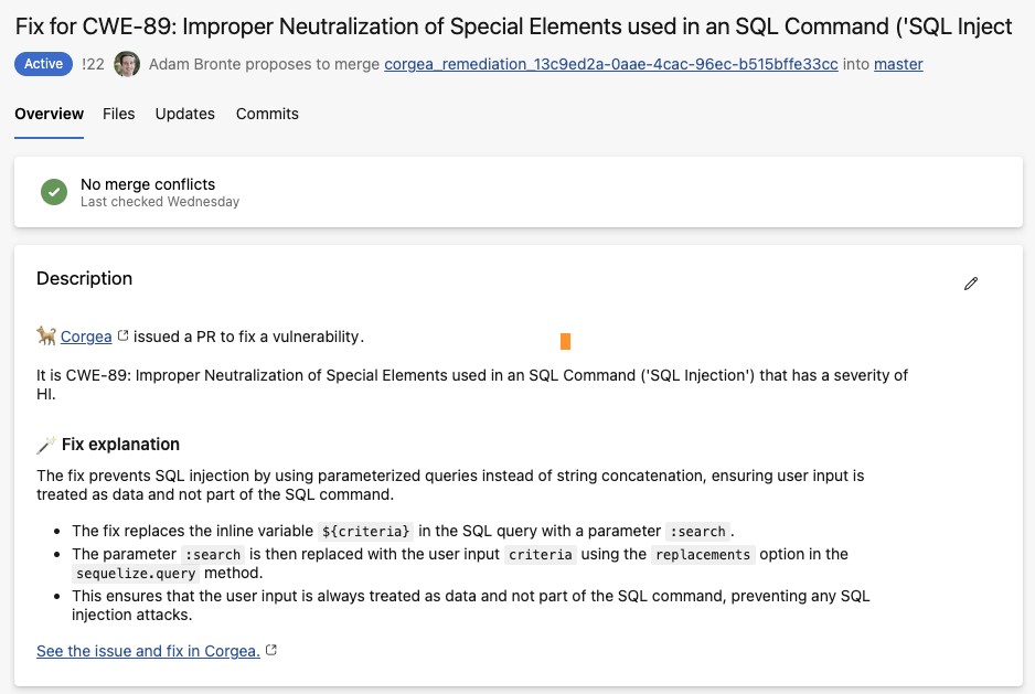 Pull Request Automation: Corgea can automatically issue pull requests to Azure DevOps repositories to address and fix insecure code. This automation ensures that vulnerabilities are managed promptly and efficiently, enhancing security without requiring manual oversight for each code correction.