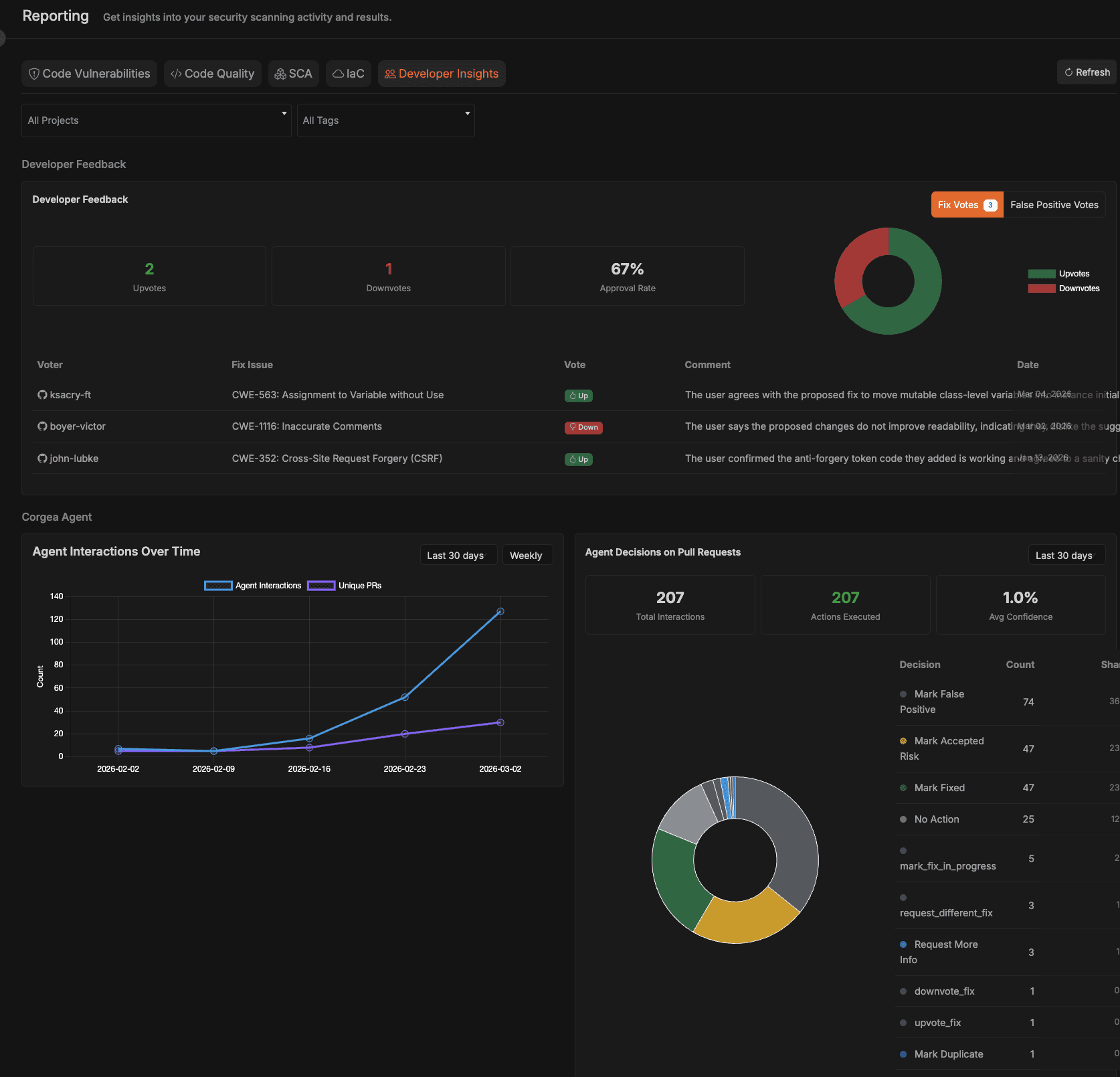 What makes it especially useful is that it is not limited to just security findings. Reporting also includes developer insights, combining developer feedback with Corgea Agent usage trends, decisions, and active-user data. That gives teams visibility not only into what issues exist, but also into how developers are engaging with security and remediation over time.
