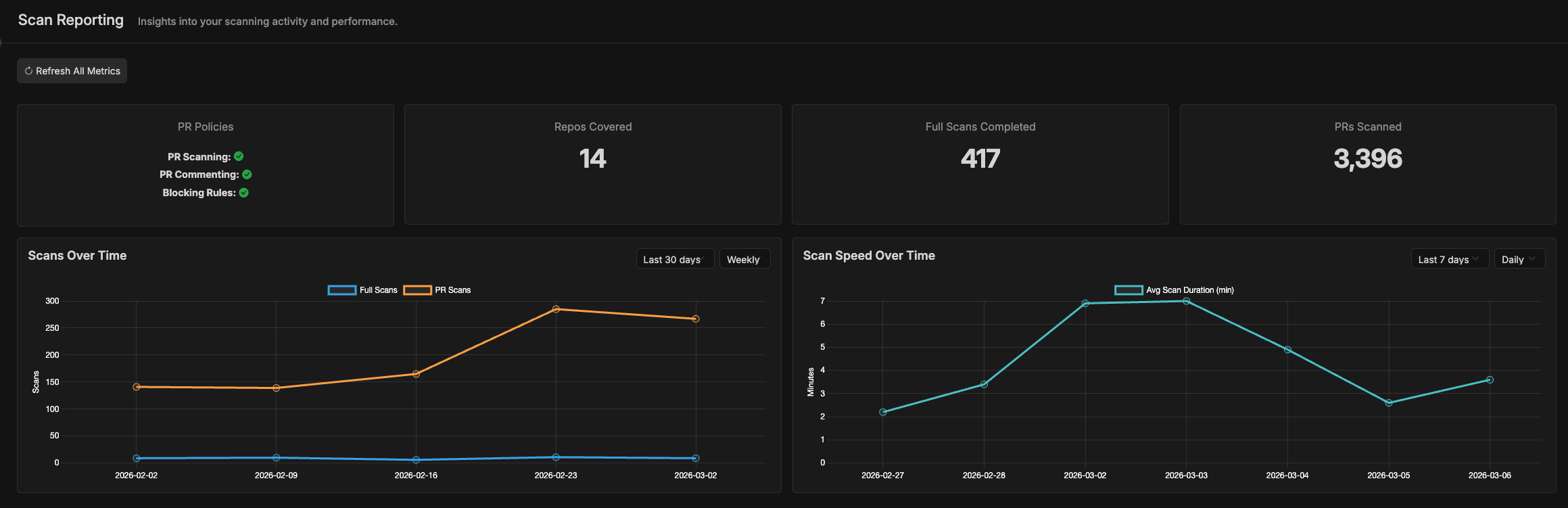 Corgea Reporting also goes beyond high-level summaries. The platform includes dedicated reporting for scan operations, such as PR policy status, repository coverage, full scans, PR scans, and scan performance over time. For teams using policies, the aging report adds another layer by showing overdue issues, average age, and where risk is accumulating by project and assignee.