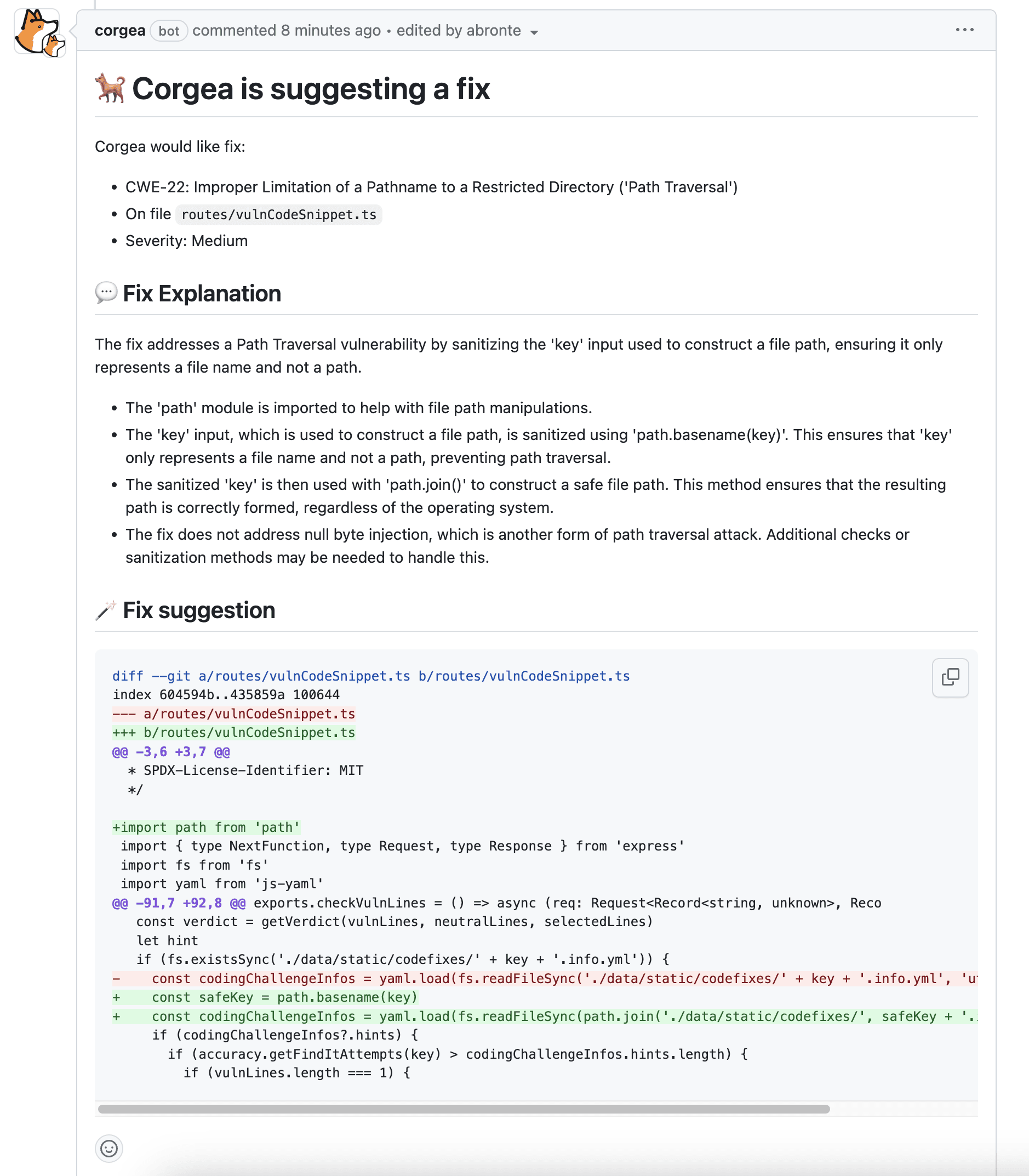 AI-Powered Fixes on the Fly: Upon detecting vulnerabilities, Corgea pinpoints the compromised lines of code, and suggests actionable, precise fix diffs directly in the GitHub pull request comments. This immediate feedback loop enables developers to address security issues before they escalate or merge into the main codebase.