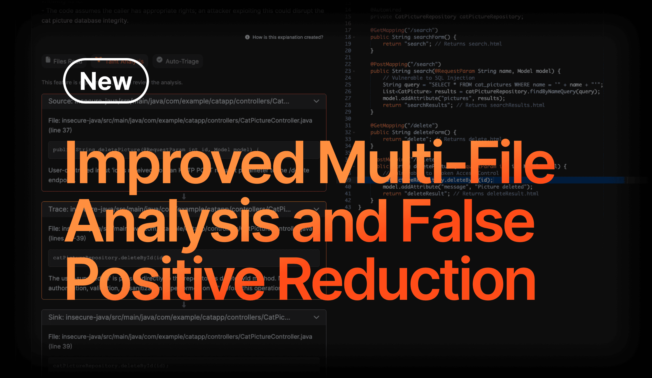 We’ve reimagined how static analysis should work—by deeply understanding the full context of your codebase. Our upgraded multi-file analysis engine transforms traditional scanning by going beyond file-by-file inspection. It now intelligently maps out your application structure, analyzing key relationships between files, imports, and dependencies to understand how your system actually behaves.