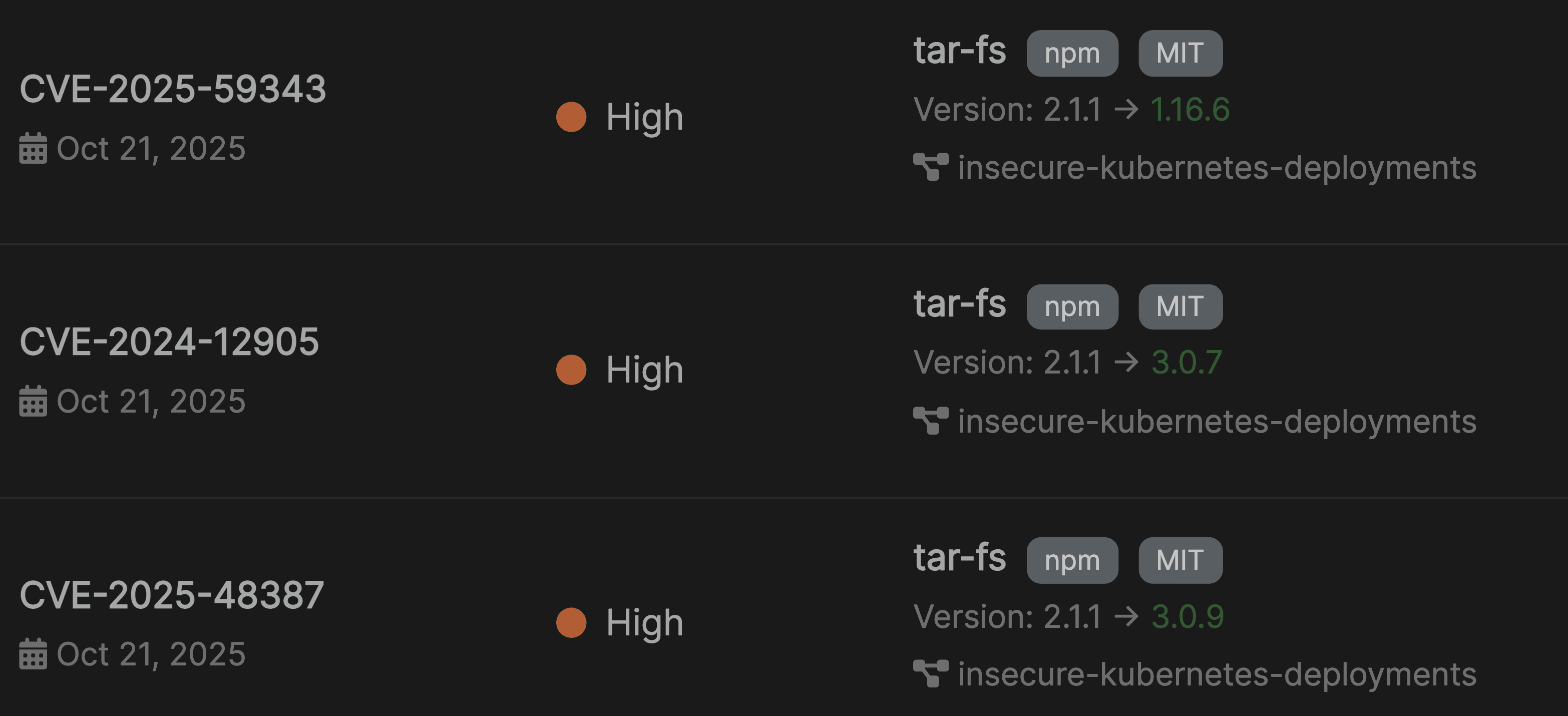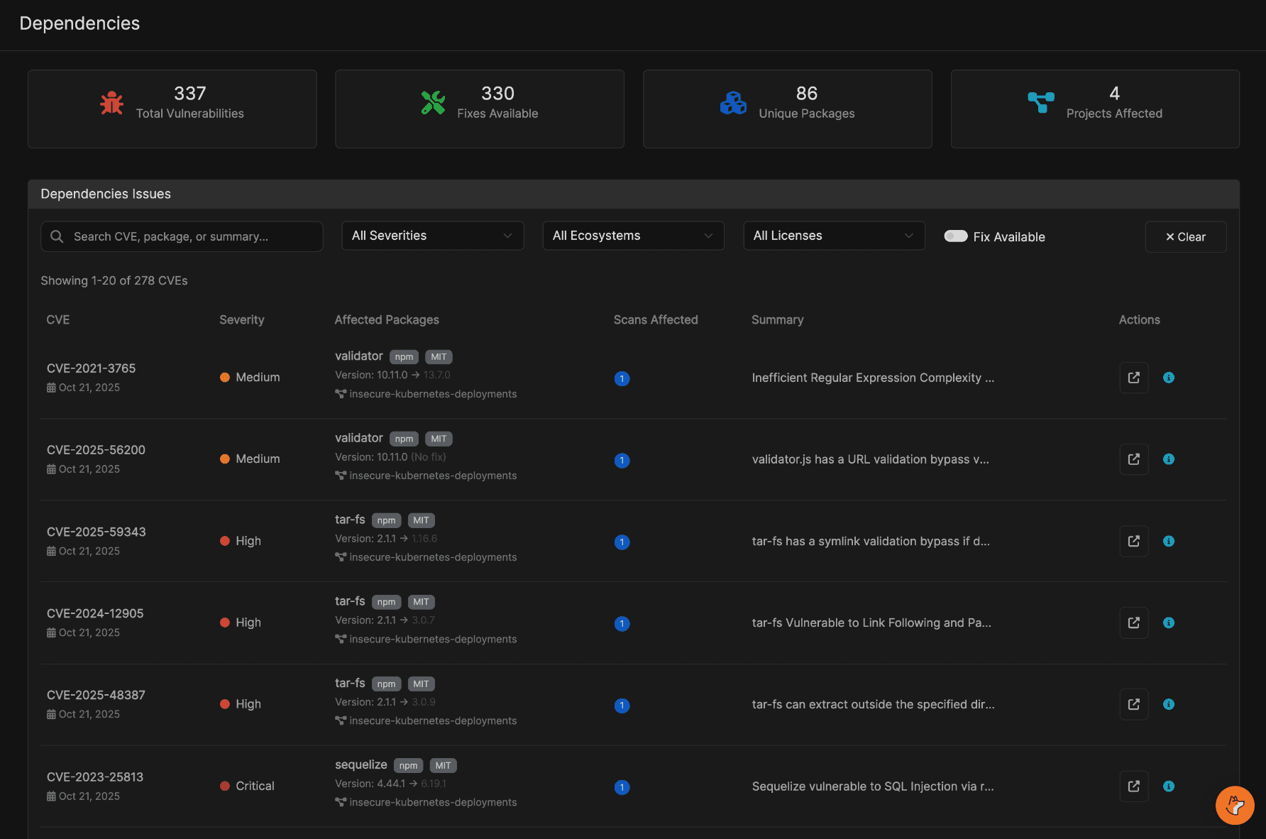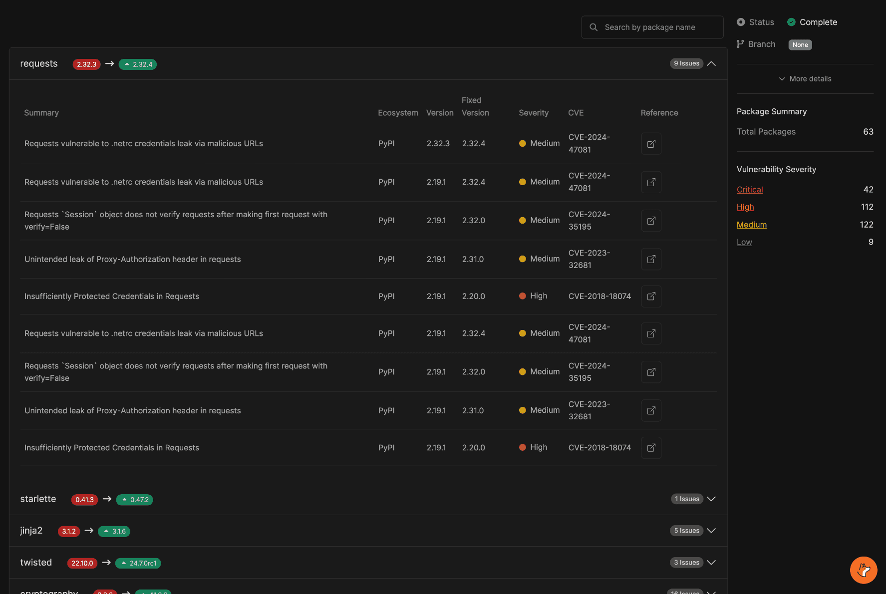 The platform consolidates these findings into one view with clear fix versions and severity levels. When several CVEs share the same patch version, Corgea groups them together, letting you fix multiple vulnerabilities with a single upgrade.