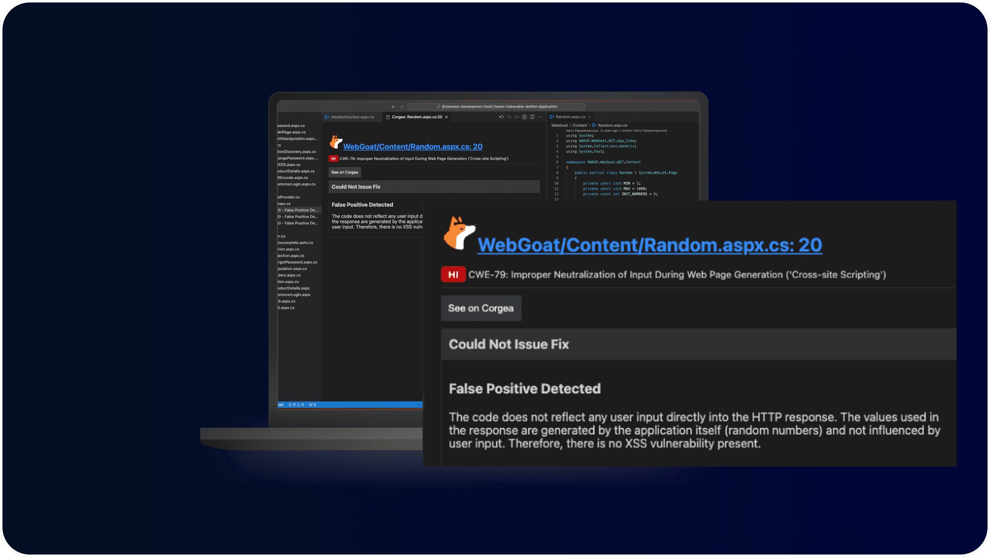 Accurate Results: This comprehensive analysis allows Corgea to deliver highly accurate results, identifying false positives with precision. The system not only flags these false positives but also provides clear and understandable explanations, making it easy for developers and security teams to trust the findings.