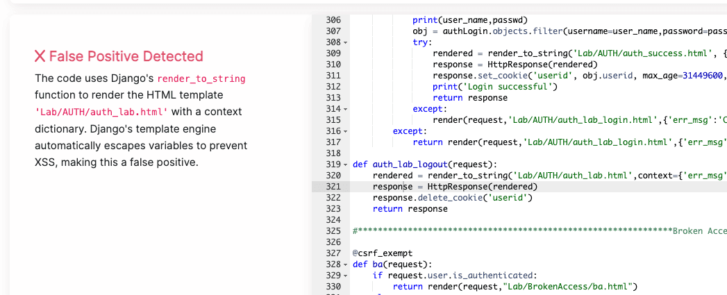 Contextual Understanding: Our AI analyzes the code to determine the context of the false positive. For instance, it can identify hard-coded secrets in a test suite as benign or detect if an injection attack is not subject to user-controllable inputs.