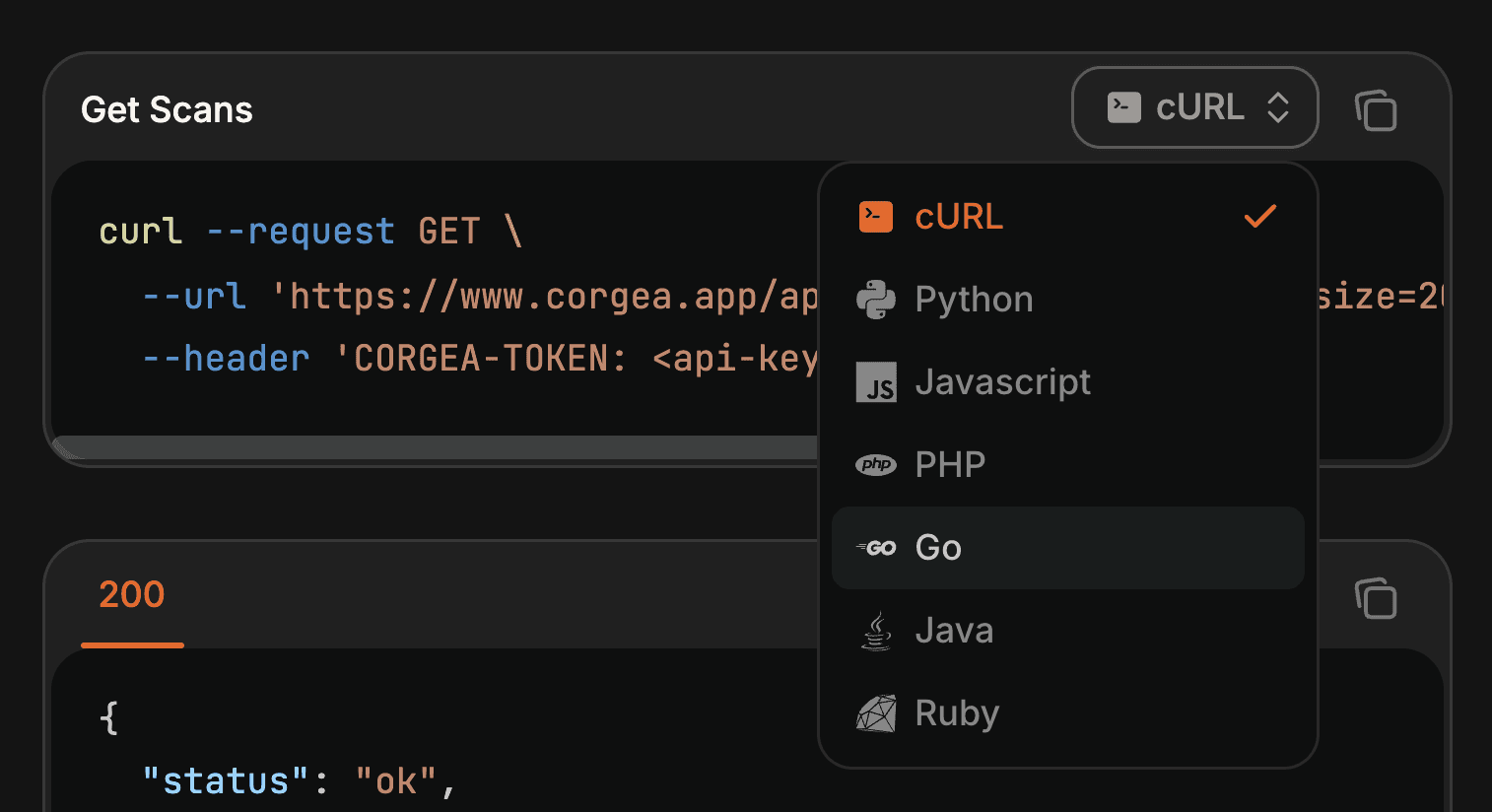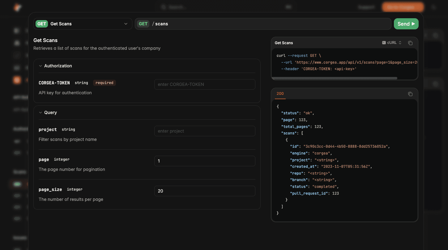 Teams can now experiment and test Corgea’s API’s through the new API playground. This is a great way to iterate and get a working version using the different script generators.