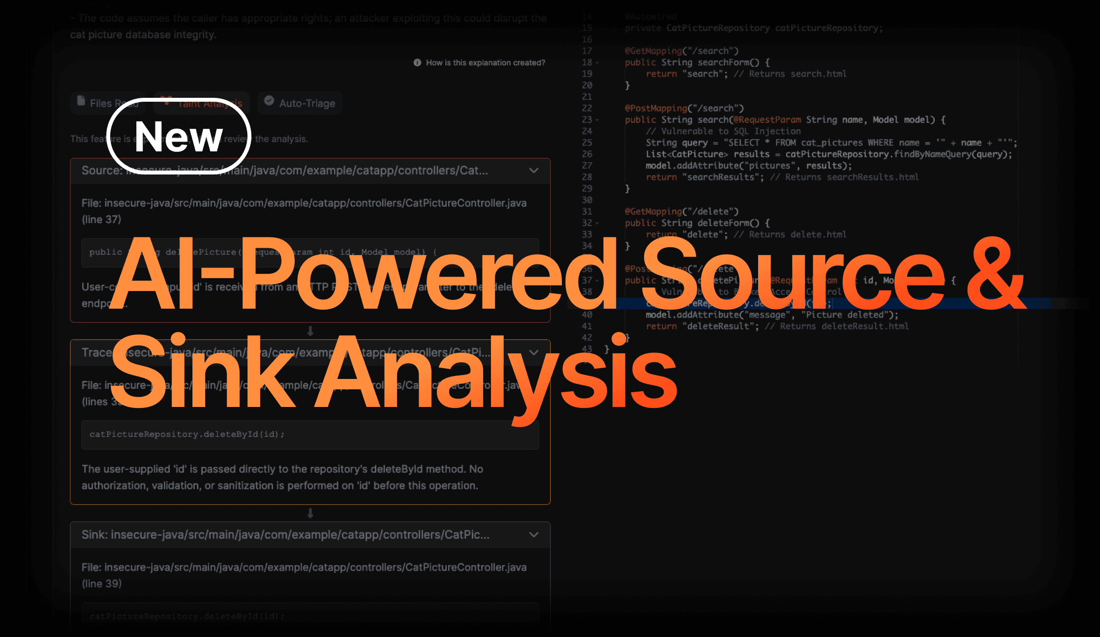 Source and sink analysis is a revolutionary security feature that brings enterprise-grade vulnerability analysis to your development workflow. Unlike traditional static analysis tools that simply point out vulnerabilities, this feature provides a comprehensive, intelligent analysis of how untrusted data flows through your entire codebase.The analysis works by first identifying the “source” - where untrusted data enters your application - and then meticulously tracing its journey through your code.