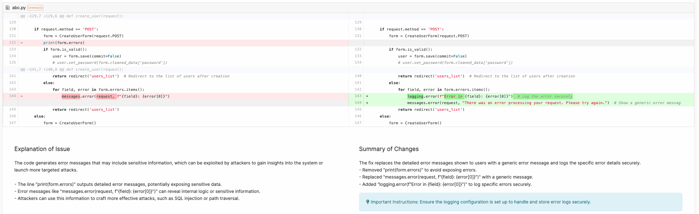 Another example that requires context to detect is the following Generation of Error Message Containing Sensitive Information vulnerability (CWE-209). The code generates error messages that may include sensitive information, which can be exploited by attackers to gain insights into the system or launch more targeted attacks. Corgea is able to understand the context that this pertains to user data, and that rendering error messages from a user can expose system information.