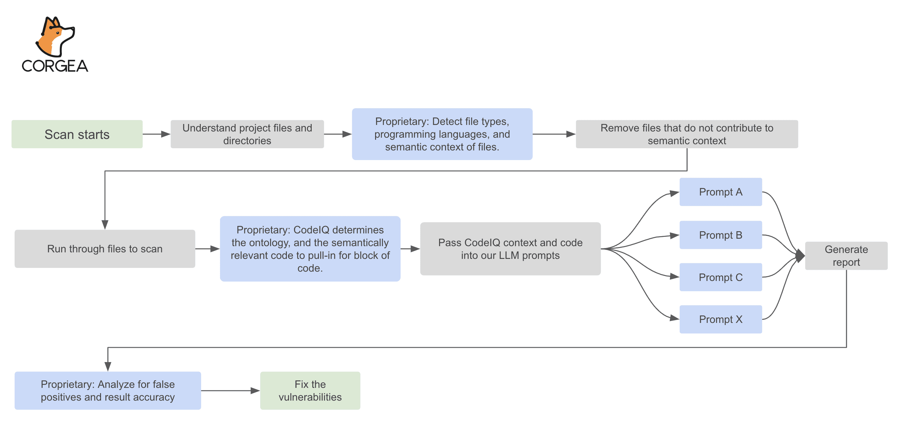 After you connect your repo (GitHub, GitLab, Azure DevOps, or Bitbucket), Corgea runs a code quality scan against the codebase during the pull request. The scan starts with standard analysis to understand file structure, language and framework patterns, and where the code’s boundaries are. Then the review layer applies deeper reasoning to identify code quality issues that are harder to capture with rules alone, things like brittle logic, inefficient patterns in hot paths, error-handling gaps, or maintainability problems that span multiple files.
